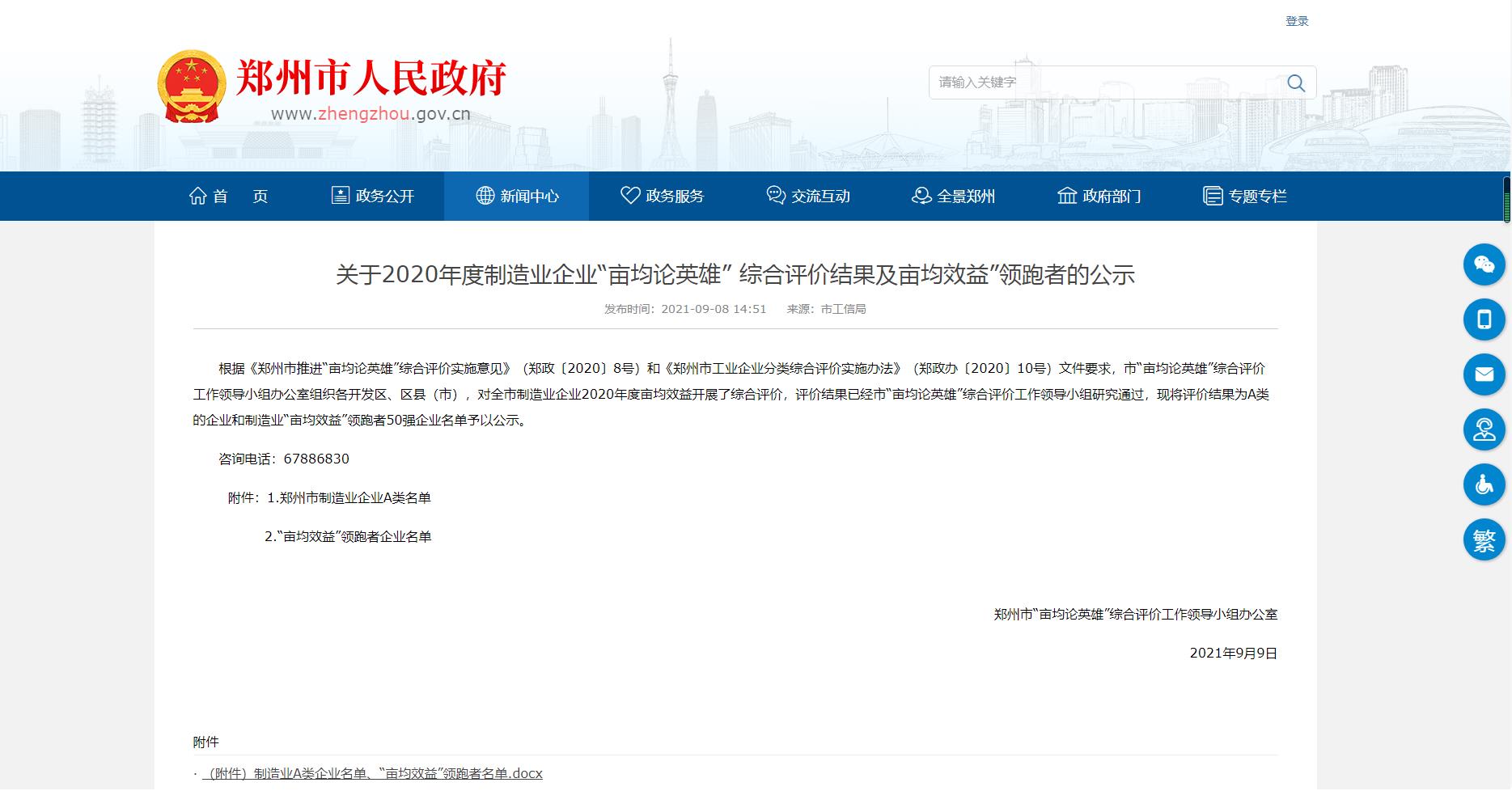 8、2021年9月,被認定為鄭州市“制造業畝產論英雄”A類企業。