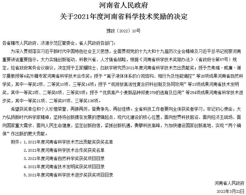 2022年3月31日,河南省人民政府發(fā)布了《關于2021年底河南省科學技術獎勵的決定》,為深入貫徹落實習近平新時代中國特色社會主義思想,全面貫徹黨的十九大和十九屆歷次全會精神及習近平總書記視察河南重要講話重要指示,大力實施創(chuàng)新驅動、科教興省、人才強省戰(zhàn)略,根據《河南省科學技術獎勵辦法》(省政府令第57號)規(guī)定,召開河南省政府常務會議進行審議