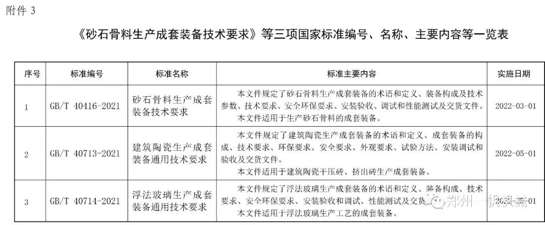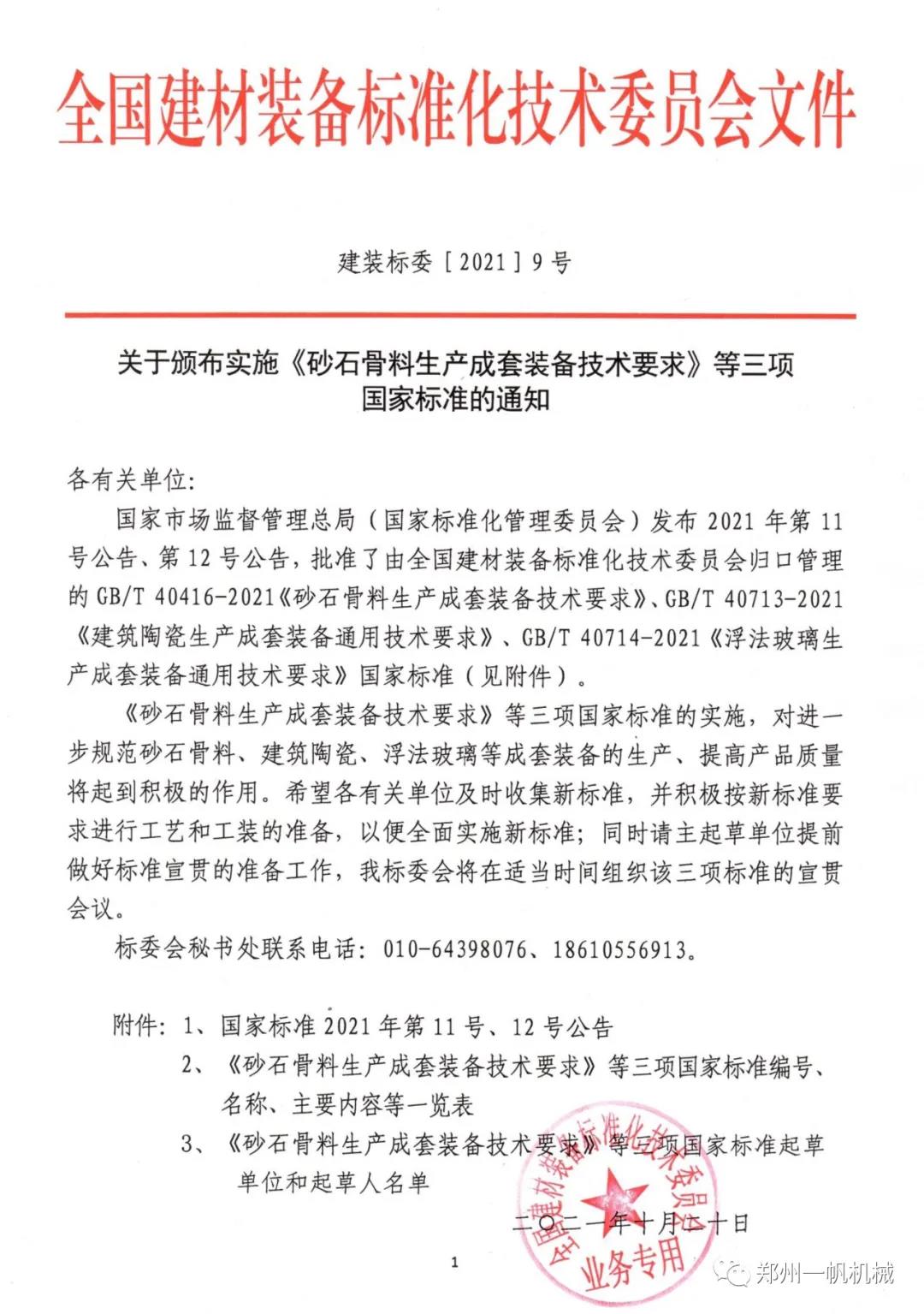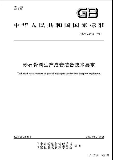 2021年10月20日,全國建材裝備標準化技術(shù)委員會頒布了關(guān)于實施《砂石骨料生產(chǎn)成套裝備技術(shù)要求》等三項國家標準的通知,其中鄭州一帆機械作為主起草單位參與了GB/T 40416-2021《砂石骨料生產(chǎn)成套裝備技術(shù)要求》國家標準的起草,此標準將于2022年3月1日起正式實施,將會對進一步規(guī)范砂石骨料等成套裝備的生產(chǎn)、提高產(chǎn)品質(zhì)量起到積極的作用。
