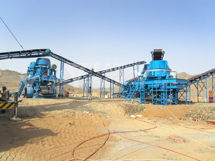 反擊破/圓錐破:原料經過粗碎后,由皮帶輸送機送到反擊破碎機(軟料:如石灰石)、或者圓錐破碎機(硬料:如河卵石、花崗巖)內進行二次加工處理,成品粒度3-60mm,再由振動篩合理篩分后,不合格石料、不滿足制砂,返回反擊破重新破碎。